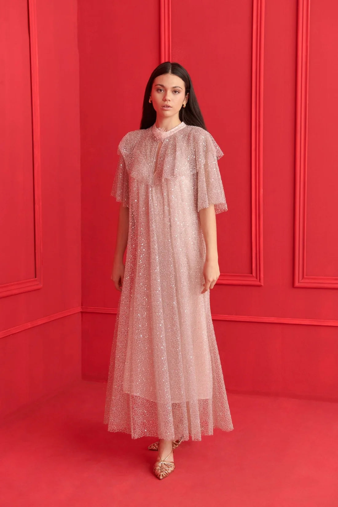 An ethereal dream in soft pink, this floor-length gown is covered entirely in delicate sequins, creating a luminous, almost weightless effect. Featuring short flutter sleeves, a subtle front keyhole, and a flower-shaped embellishment at the neckline, it exudes quiet elegance and refined romance. A statement of understated glamour for unforgettable evenings.