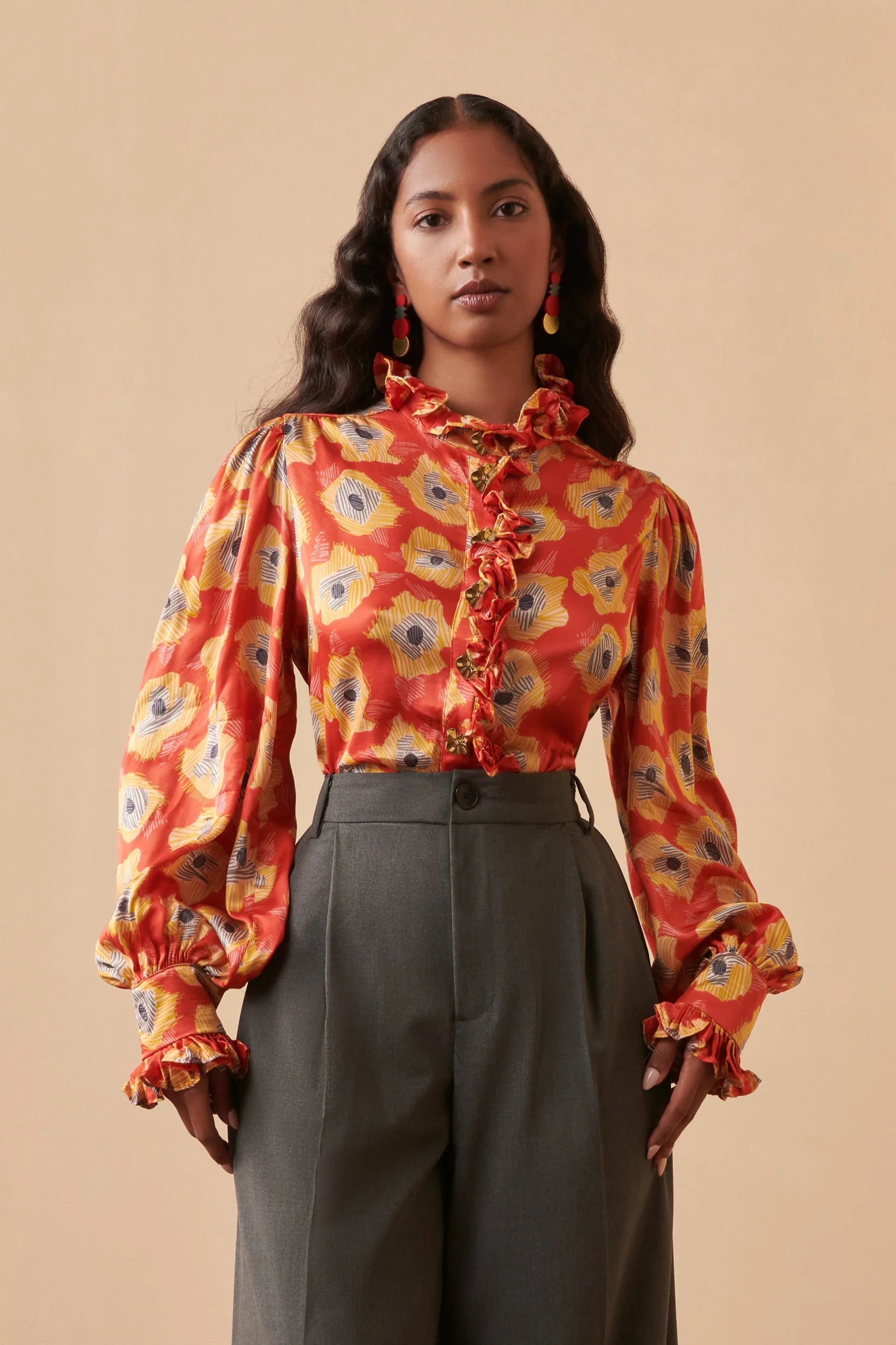 The Aurora Top brings romantic drama to everyday style. Crafted from lustrous silk in a vibrant sunset-orange base with oversized yellow poppy motifs, it features cascading ruffles along the neckline and down the front, plus voluminous puff sleeves with gathered cuffs. Pair it with tailored trousers for an elevated day-to-night look.