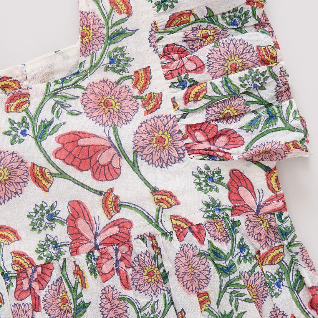 Flight Of Fancy! Colorful winged friends alight in a bountiful hanging garden in our richly detailed Butterfly Vines print shown here our much loved Baby Girls Elsie Bubble. Designer details include a square neckline, soft ruffle sleeve, glitter button closure at the back and petal pink tipped elastic leg openings. Ring snap closure at the legs allows for easy diaper changes.