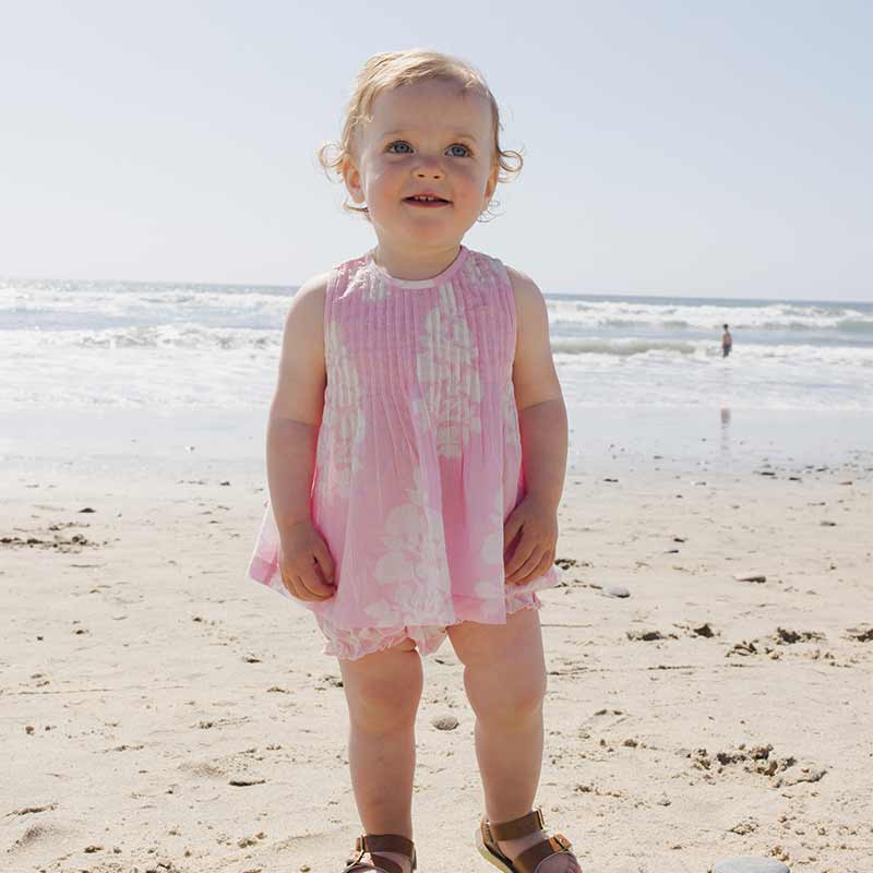 Summer Breeze! Our much loved Baby Girls Jaipur 2-Piece Set radiates a pleasant sense of nostalgia with its delicate pintucked sleeveless top featuring an open back and glitter button back closure. The elastic waist diaper cover features a matching trim detail at the leg and a color coordinated fixed satin bow at the waist. Your little one will be cool and comfortable all summer long in this breezy set.