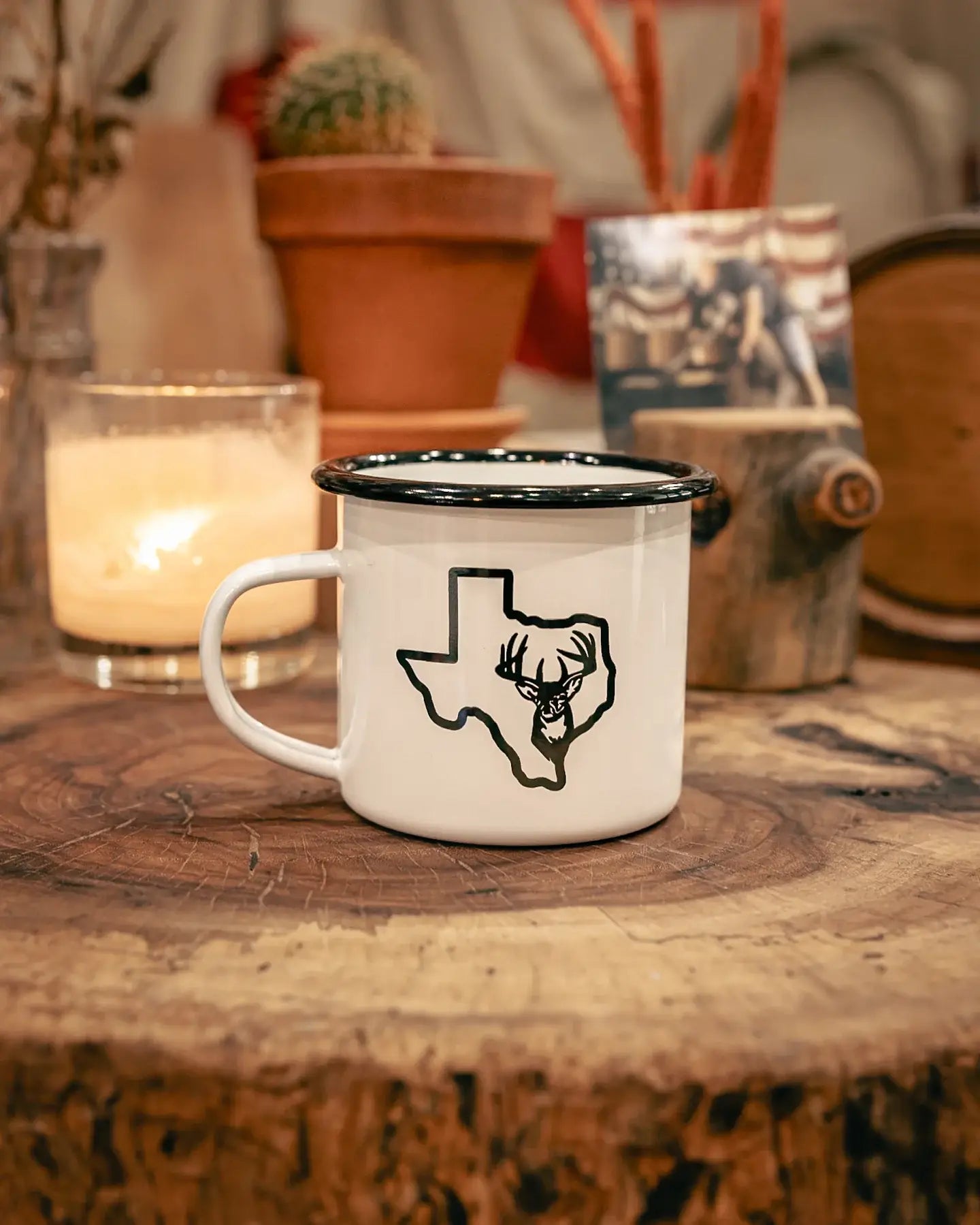 Start your day with style using our durable enameled coffee mug, featuring our exclusive Texas Outline Buck design that adds a bold touch to every sip.