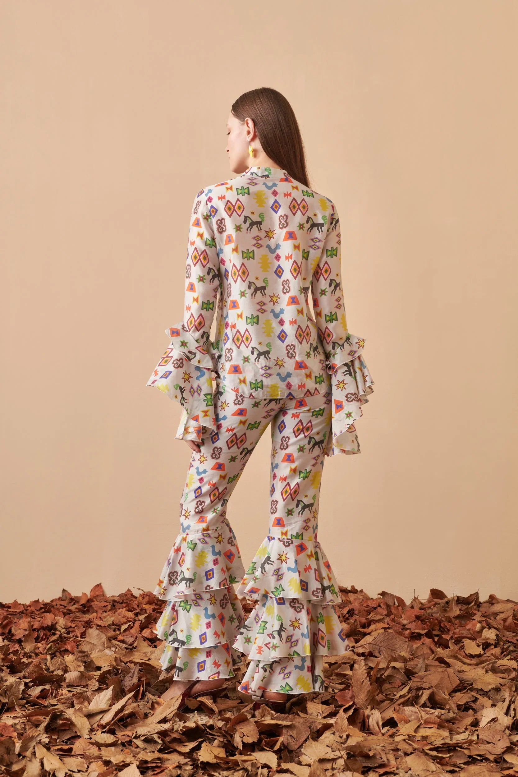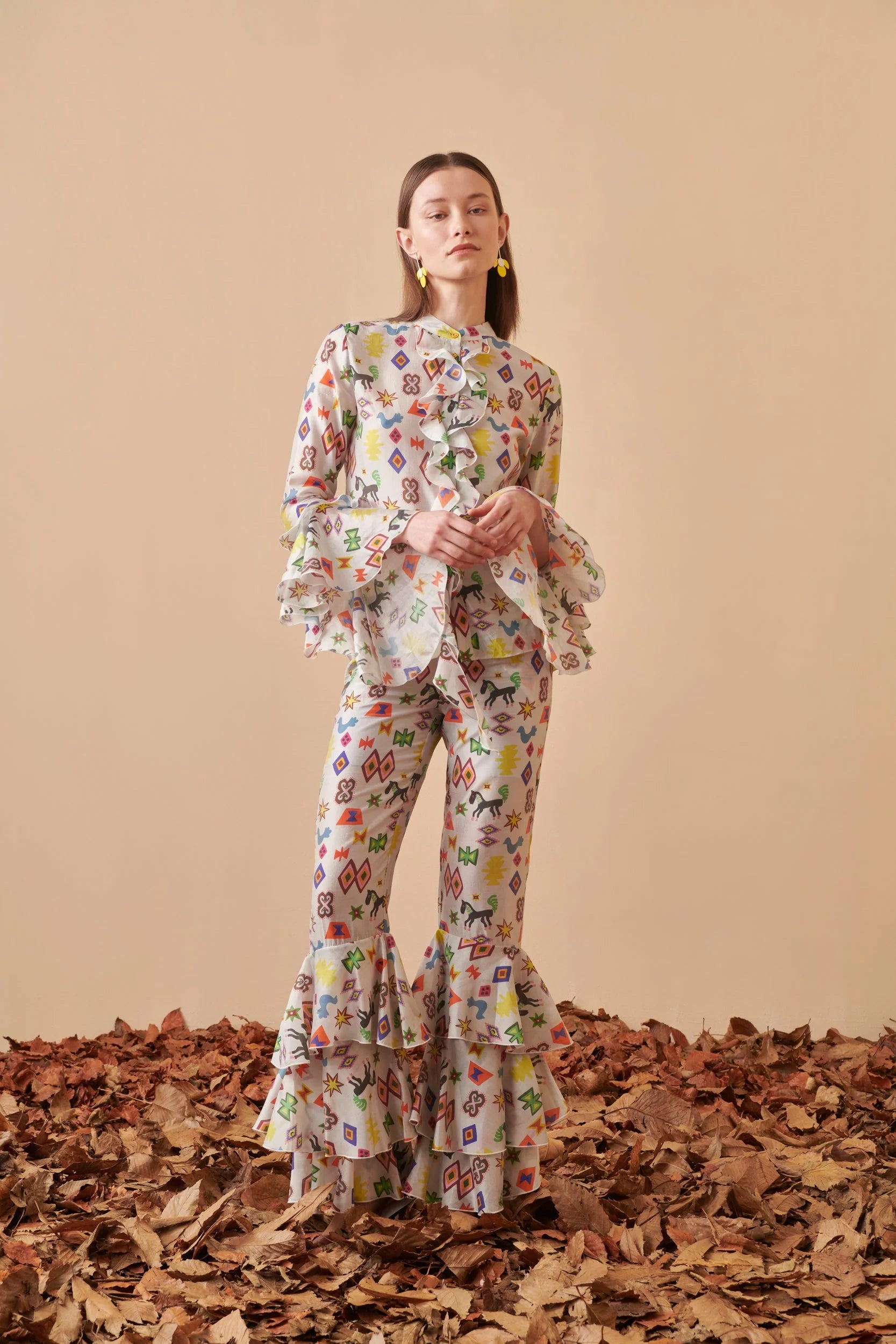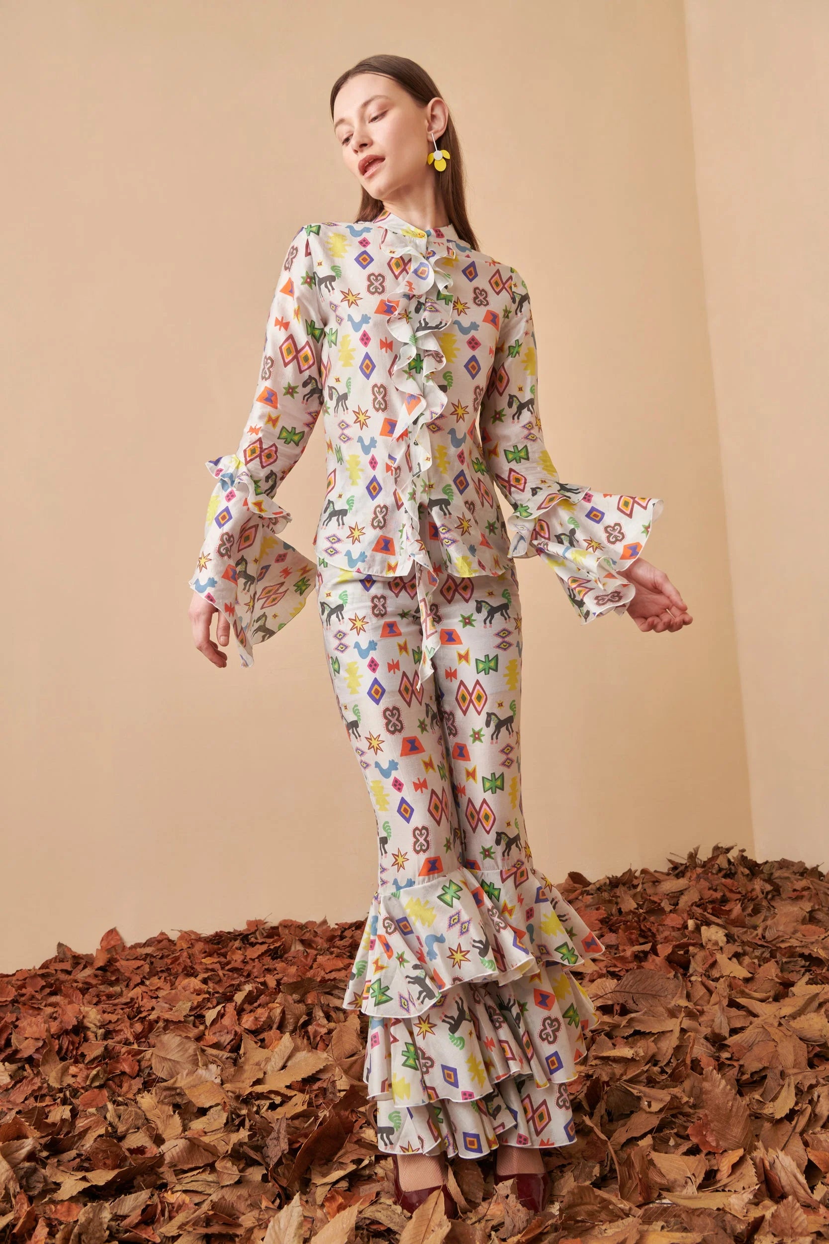 The Delight Top brings movement and charm with its flowing silhouette and vibrant all-over print featuring horses, stars, diamonds, and geometric symbols in vivid shades of red, yellow, green, blue, and orange. Crafted in lightweight fabric, it’s designed with a button-down front framed by cascading ruffles and dramatic tiered bell sleeves. A playful yet elegant piece perfect for pairing with the matching set.