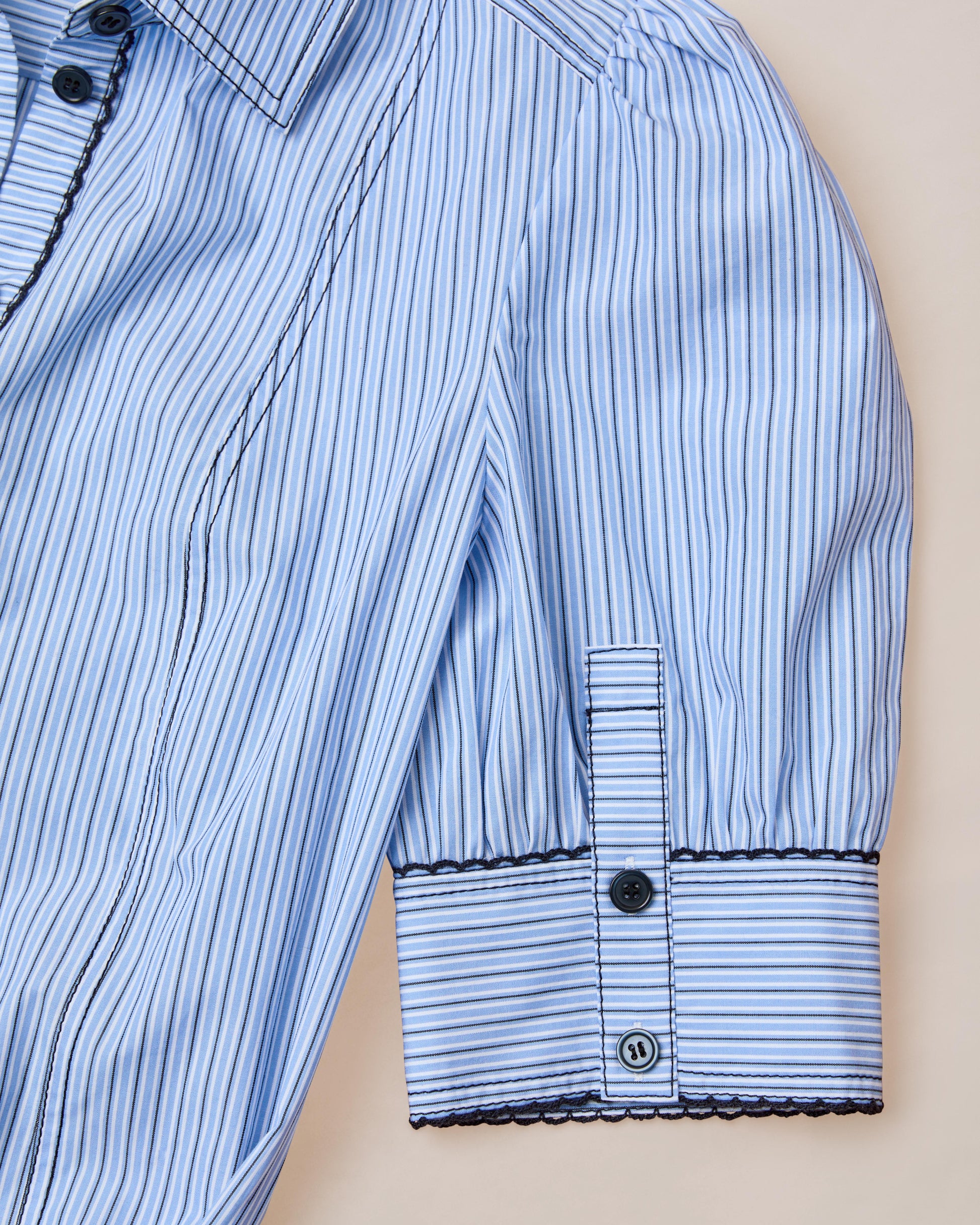 - Classic Structure: Pointed collar, puff sleeves, and full-length buttons