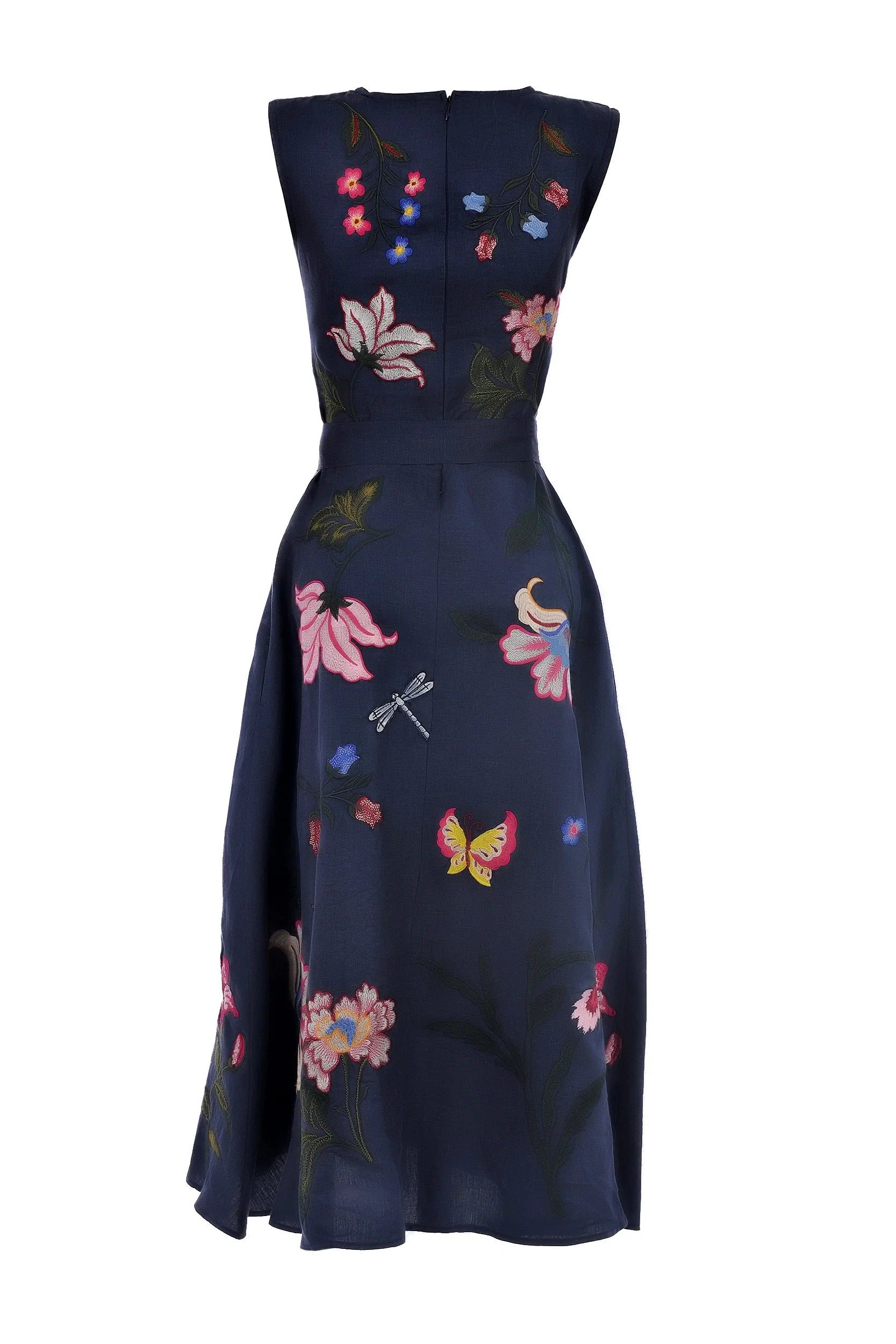 Cotton Poplin Sleeveless Midi Dress with Floral Embroidery. Spring and Summer occasions meet their match with this crisp, classic silhouette steeped in handmade floral detail.