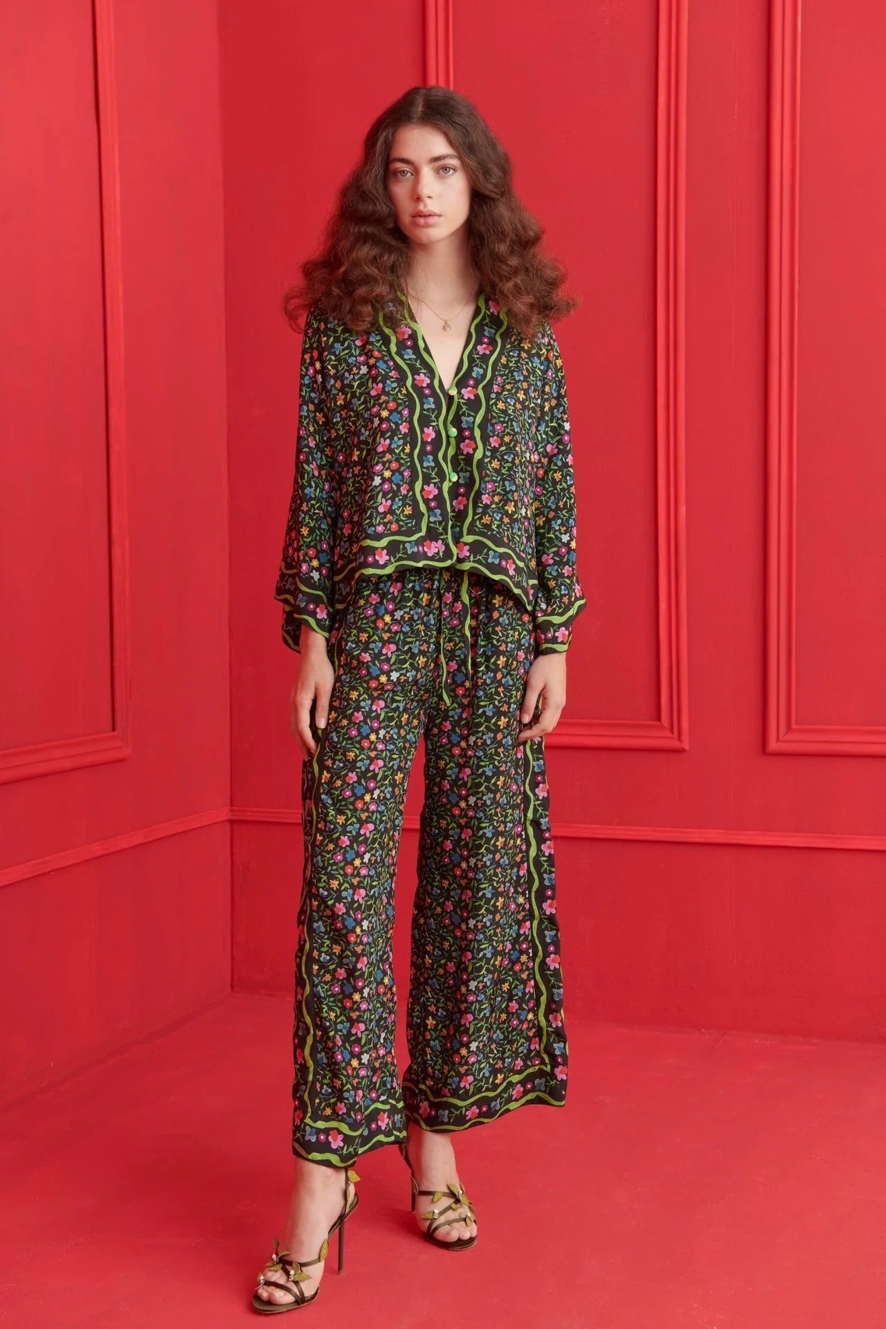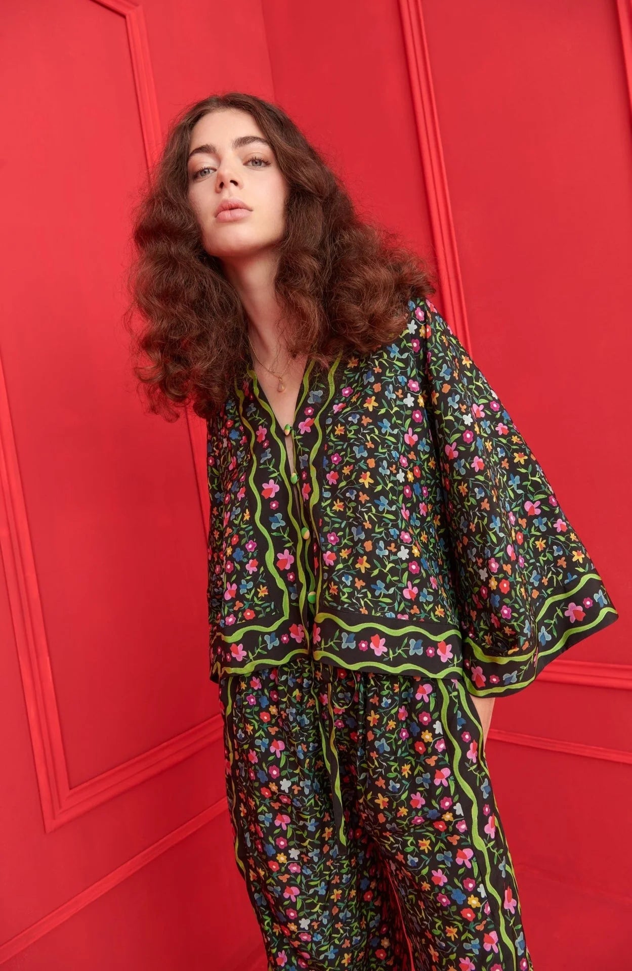An elevated take on relaxed dressing, the Hala Top blends a flowing silhouette with botanical charm. Designed with wide sleeves and a V-neckline button-down front, it features a lush floral print bordered by vibrant green and fuchsia lines that draw the eye to the midnight-black base. Pair it with the matching Hala Pants (sold seperately) for a complete, head-turning look.