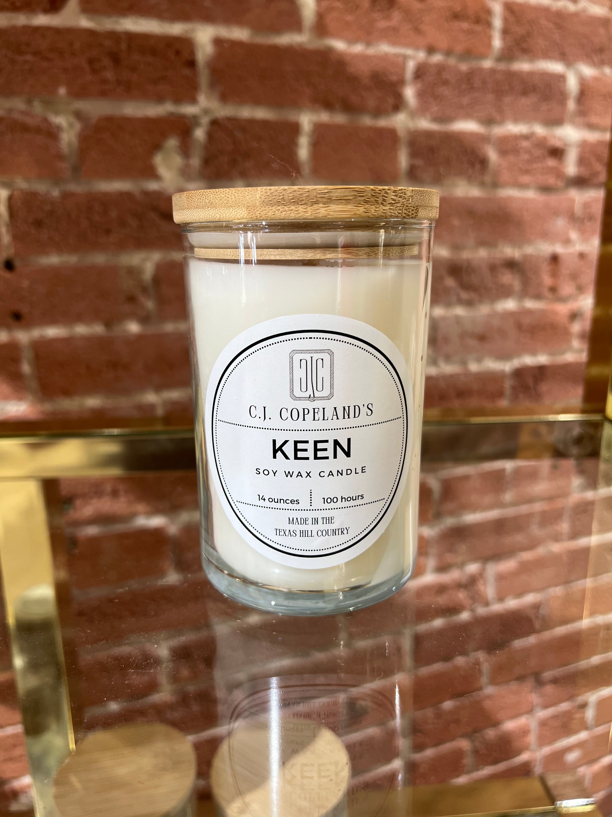 Our Keen scented candle is the very essence of a Texas candle: a woody, spicy scent with hints of laurel, sage, and pine. Magnificently aromatic, earthy, clean and fresh.