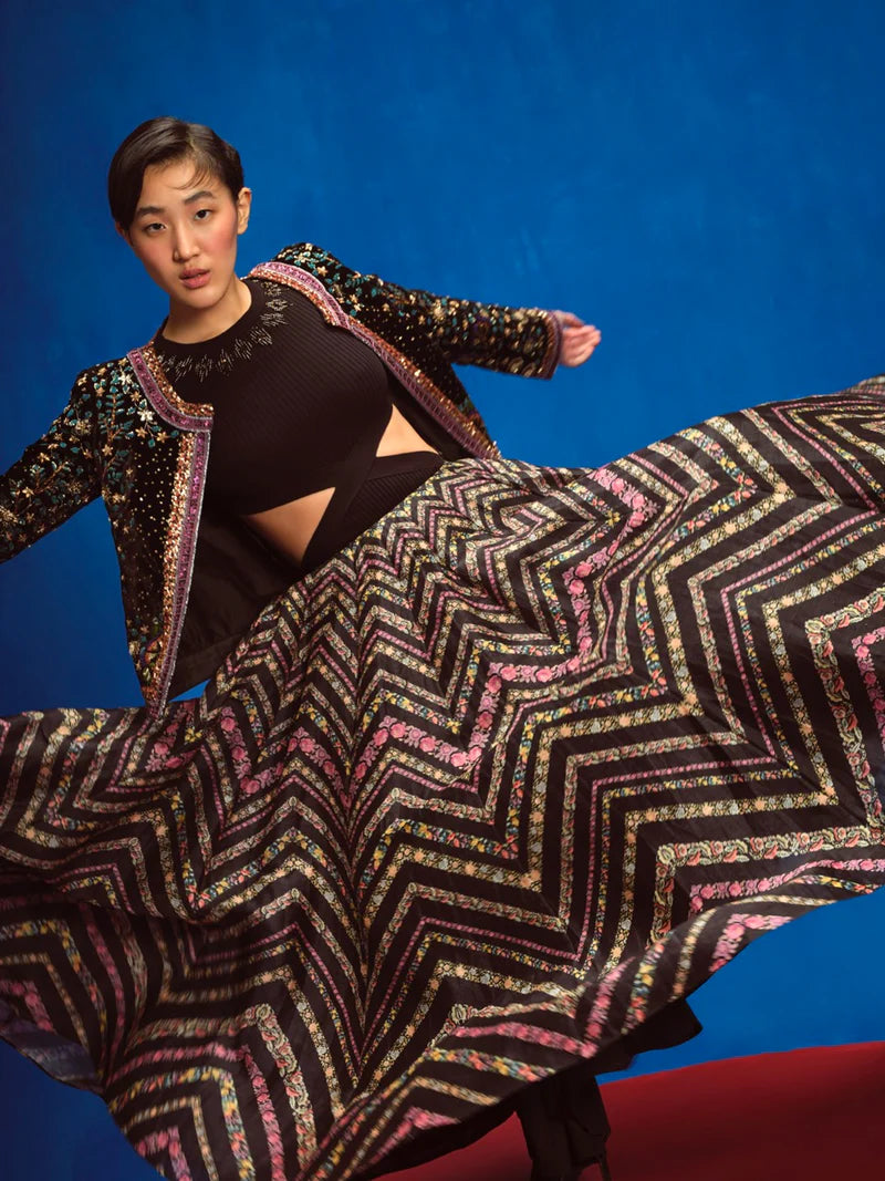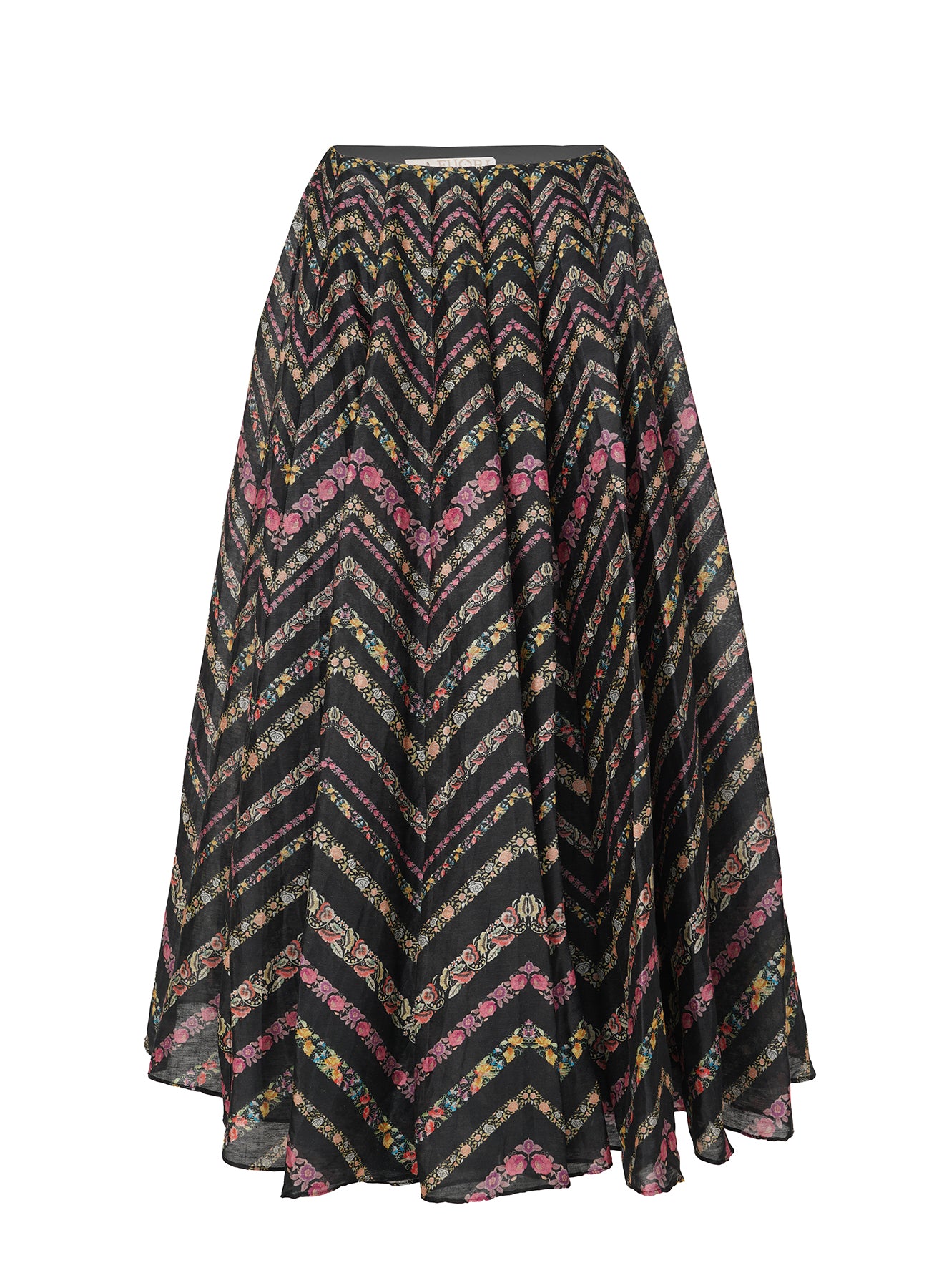 The Kessa midi paneled skirt, made from silk linen organza, features a distinctive panel design and a beautiful floral stripe print. Its elegant fabric and intricate detailing make it a stylish and sophisticated choice.