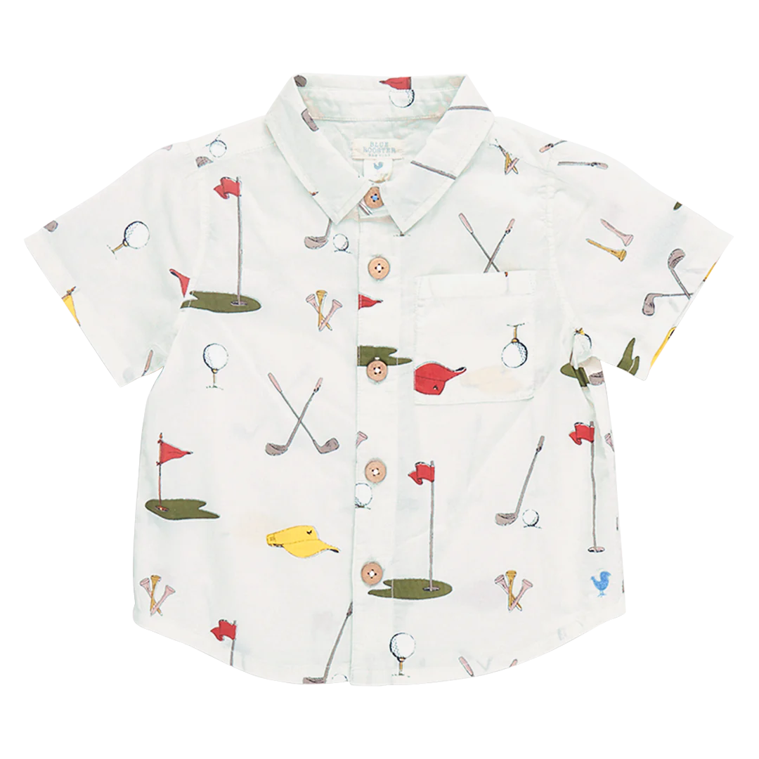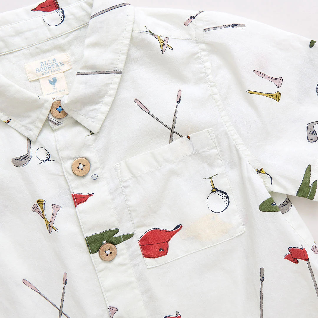 Tee Time! Our Golf Tournament conversation print is a hole in one on our Mens Jack Shirt. Everything you need for a fun day on the links appears right here on this short sleeve, collared collection classic. Faux coconut wood buttons down the front and a pattern on pattern chest pocket, perfect for extra tees, round out the look.