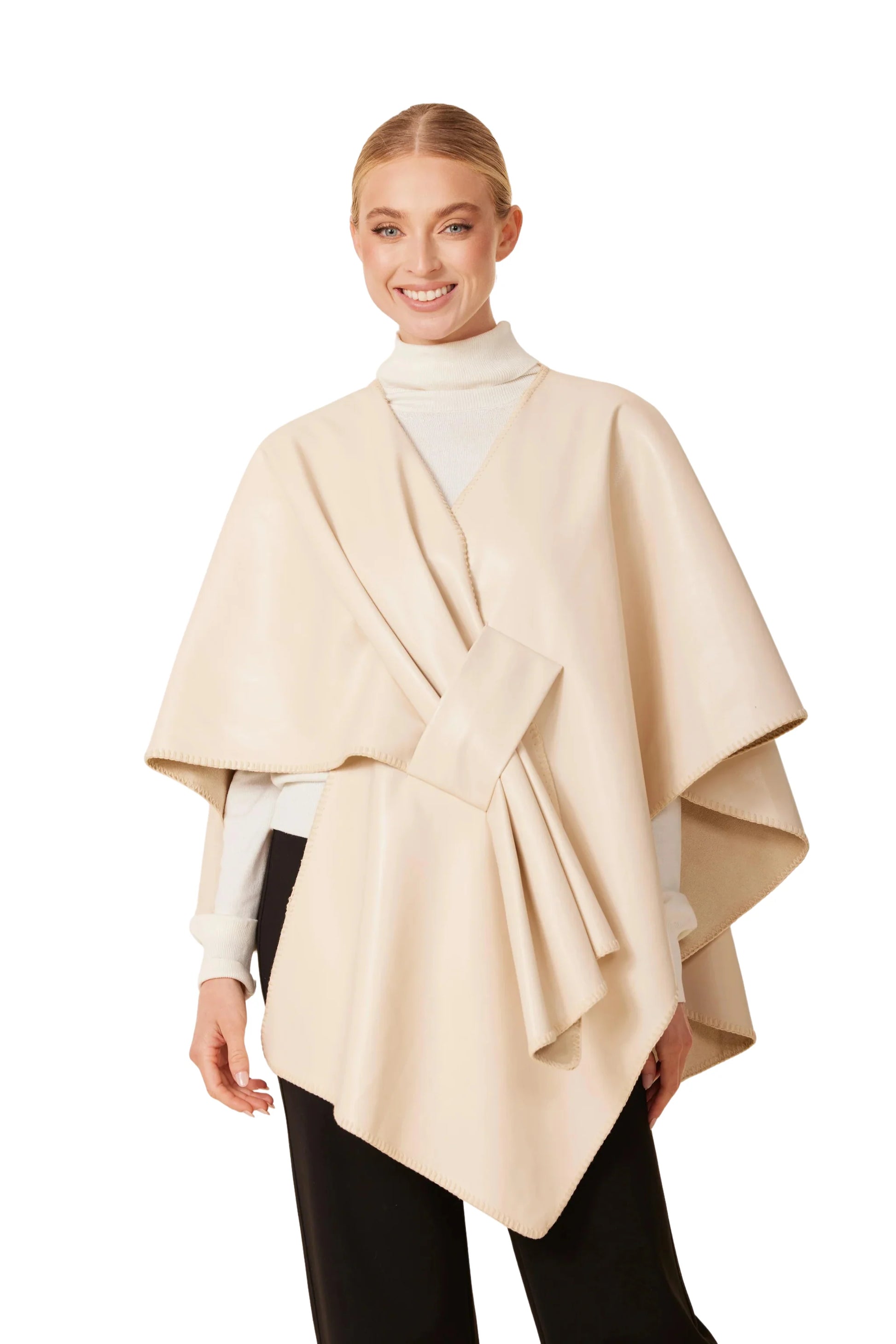 Stay cozy and chic in our faux leather wrap, a versatile layering piece perfect for Fall & Winter. Designed with a draped silhouette and soft faux suede lining, this faux leather cape wrap adds warmth and sophistication to any outfit. Pair it with sweaters, tailored pants, or dresses for effortless fall layering and seasonal style.